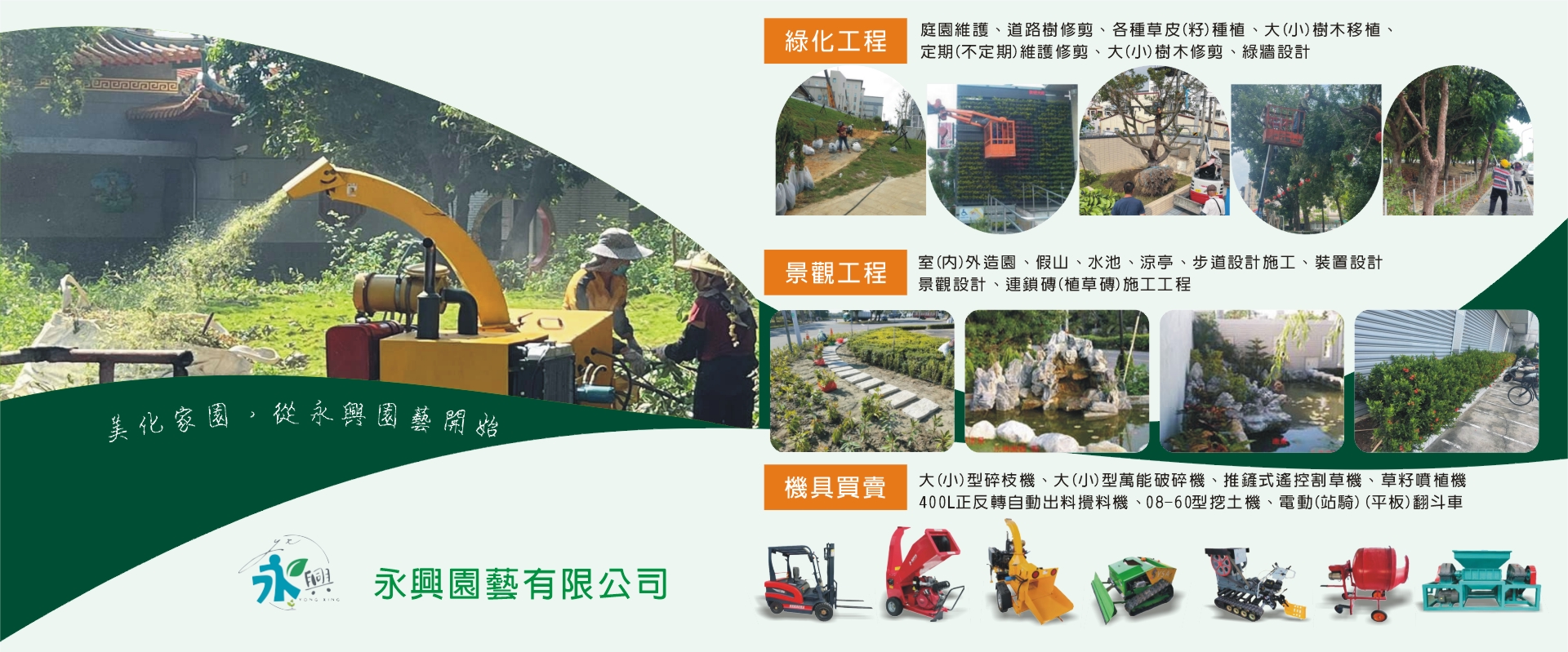 綠化工程、景觀工程、大小面積草籽噴植、農機具買賣、草皮種植、綠牆設計施工、庭園用樹、道路用樹、各種草皮、草籽噴植、大小樹木移植、草木定期維護修剪、草木不定期維護修剪、造園假山、水池、步道、設計裝置、庭園景觀造景、公園綠化、機關造景綠化、室內外假山造景、空中花園、假山噴水、停車場植草磚、連鎖磚施工工程、工廠種樹、景觀施工、植草磚、連鎖磚、園藝、生態池、永興園藝、庭園